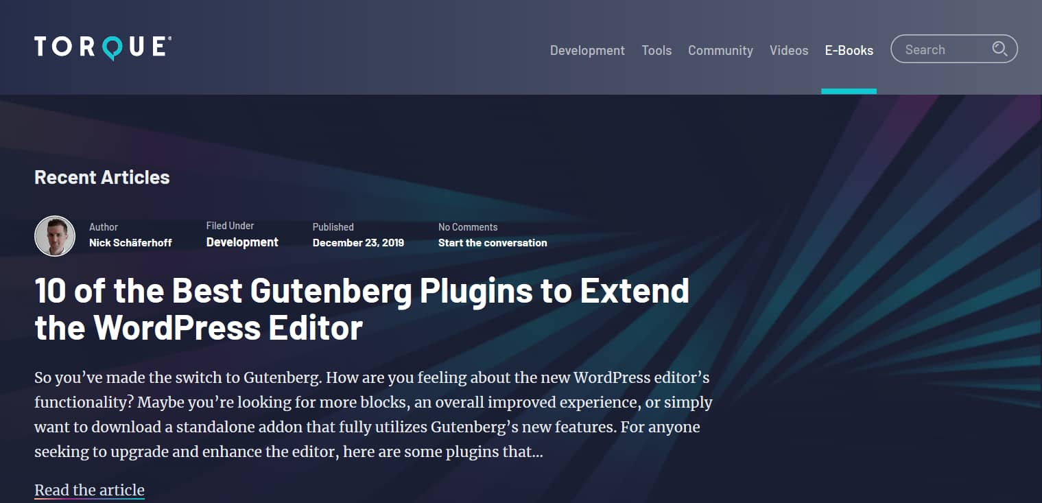 Torque keeps its posts in well-defined categories, catering to different types of readers: community, beginners, developers, and “learn” (their how-to section). Also, there are separate sections for themes and plugins.