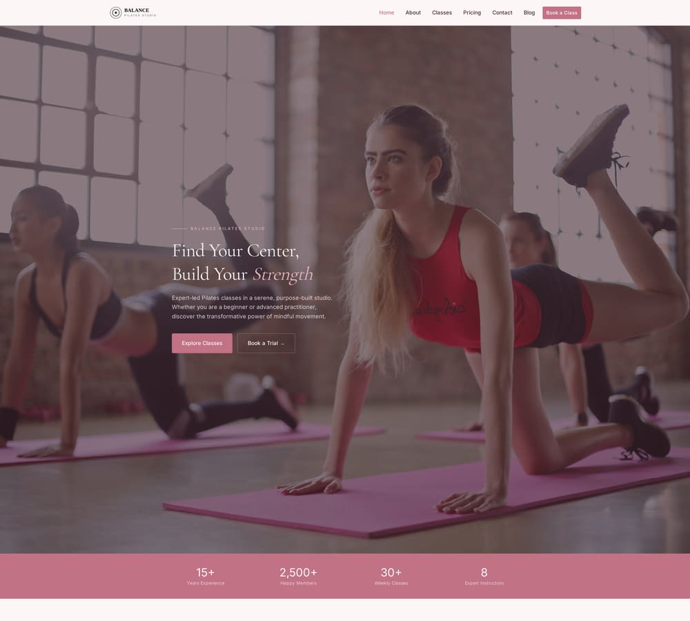 Clean pilates studio website template designed for pilates instructors, reformer studios, and mat class teachers. Introduce trainers, list the class schedule, and enable sign-ups with a bright, movement-focused layout.