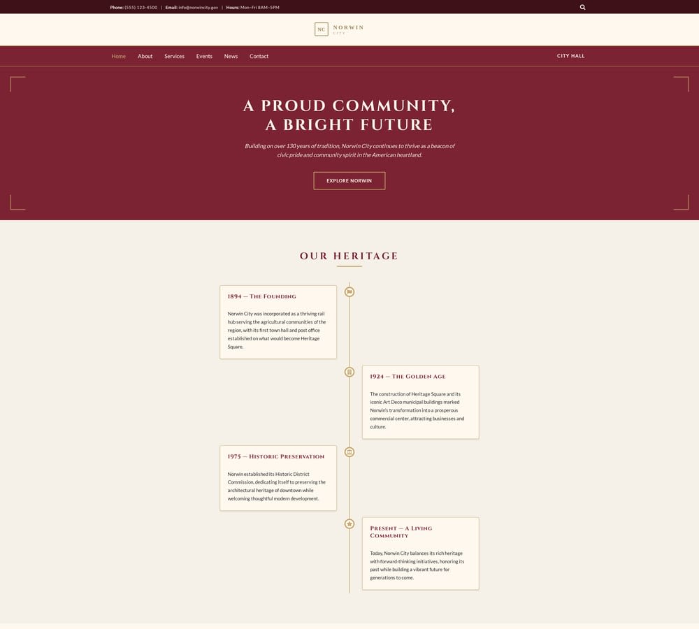 Heritage-inspired municipal government website template designed for cities, towns, and boroughs. Present community services, publish local events and news, and showcase your city’s history and heritage with a formal yet approachable civic design.
