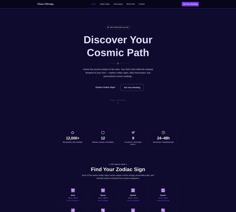 Mystical astrology website template designed for astrologers, tarot readers, and spiritual practitioners. Offer readings, publish horoscopes, and sell services in an atmospheric, cosmic-inspired layout that leans into wonder.