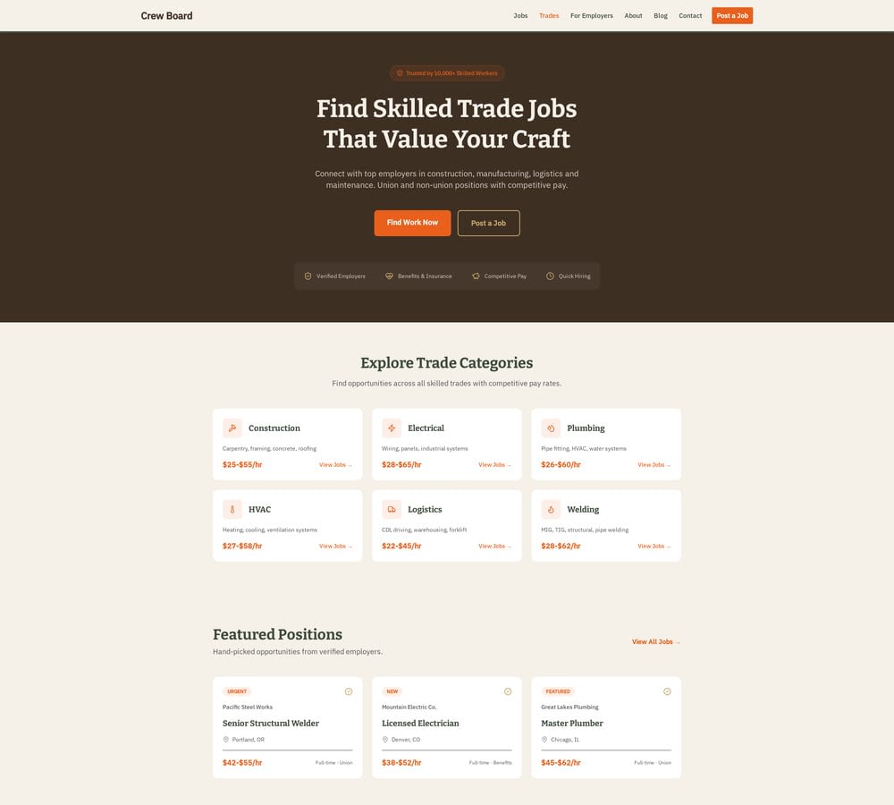 Specialized crew board website template designed for yacht crew agencies, film production crew marketplaces, and skilled-trades job boards. Post positions, filter candidates, and capture applications with a utility-first layout.