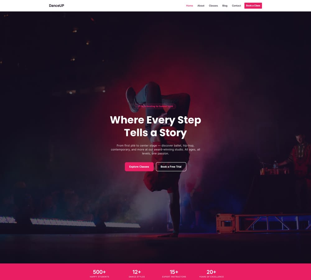 Energetic dance school website template designed for dance academies, ballet studios, and contemporary dance programs. Present class levels, meet the teachers, and showcase student performances with a rhythmic, youthful design.