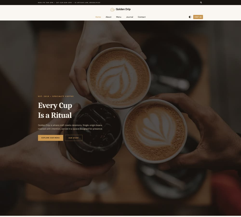 Artisan coffee shop website template designed for specialty cafes, roasters, and coffee brands. Showcase your menu, tell your origin story, highlight your brewing philosophy, and invite visitors into your space with a warm, minimalist aesthetic inspired by Japanese design.