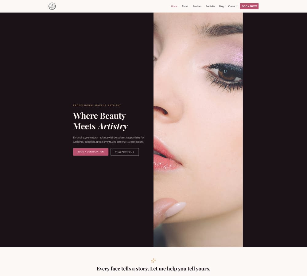 Editorial makeup artist website template designed for professional MUAs, bridal artists, and beauty creators. Feature your looks, services, and testimonials with a soft, editorial-grade design that lets the artistry lead.