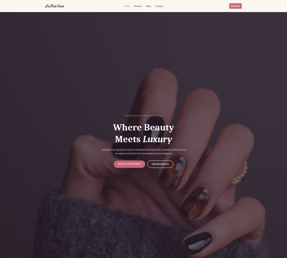 Elegant nail salon and spa website template designed for manicure studios, pedicure spas, and nail artists. Highlight signature services, browse-ready price lists, and a bookable gallery of looks in a polished, feminine layout.