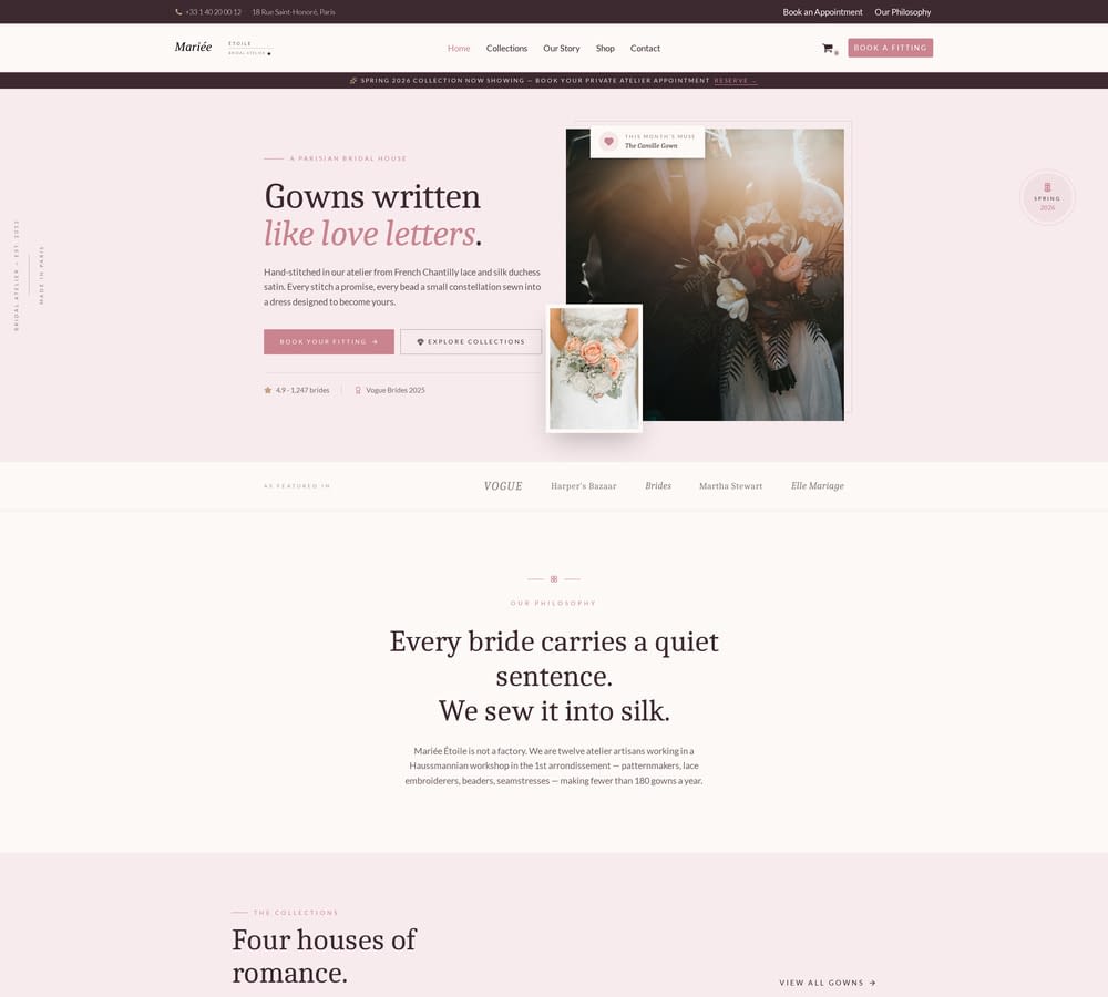 Romantic wedding dress shop website template designed for bridal boutiques, couture ateliers, and wedding dress designers. Feature collections, trunk shows, and consultation bookings in an elegant, editorial bridal layout.