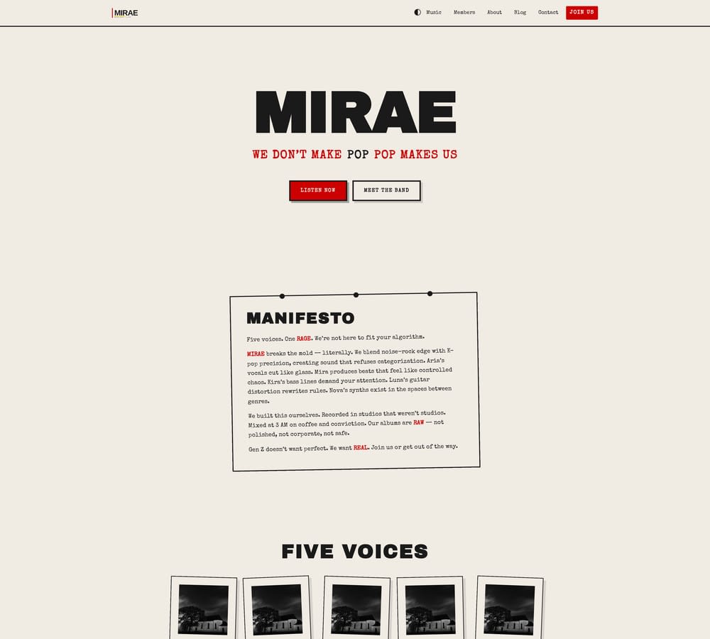 Bold music band website template designed for artists, musicians, and indie bands. Showcase your music, introduce band members, promote upcoming events, and connect with fans through a punchy, high-energy design with strong visual identity.
