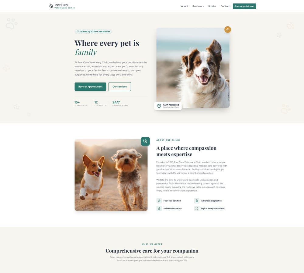 Warm and professional veterinary clinic website template designed for animal hospitals and pet care practices. Showcase your services, introduce your team of veterinarians, share patient success stories, and make it easy for pet owners to book appointments online.