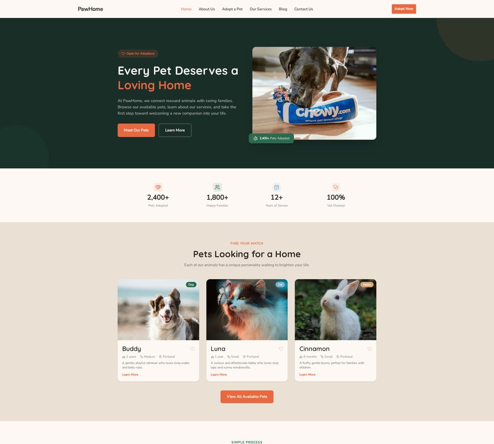 Heartfelt pet adoption website template designed for rescue shelters, animal adoption centers, and fostering programs. Feature adoptable pets, success stories, and a donate/volunteer flow in a warm, mission-led layout.