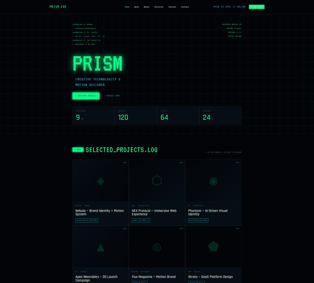 Retro-futuristic creative portfolio website template designed for motion designers, creative technologists, and digital artists. Showcase your work, list your services, and attract project inquiries with a bold terminal-inspired aesthetic that stands out.