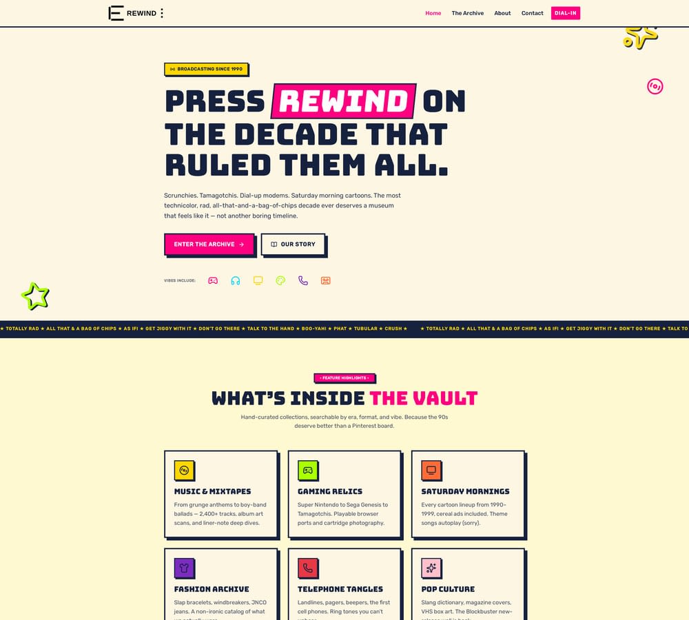 Neon-soaked 90s nostalgia website template designed for retro brands, throwback blogs, and pop culture publications. Celebrate the decade with a chunky, VHS-era layout built for lifestyle stories, playlists, and vintage-flavored shop pages.