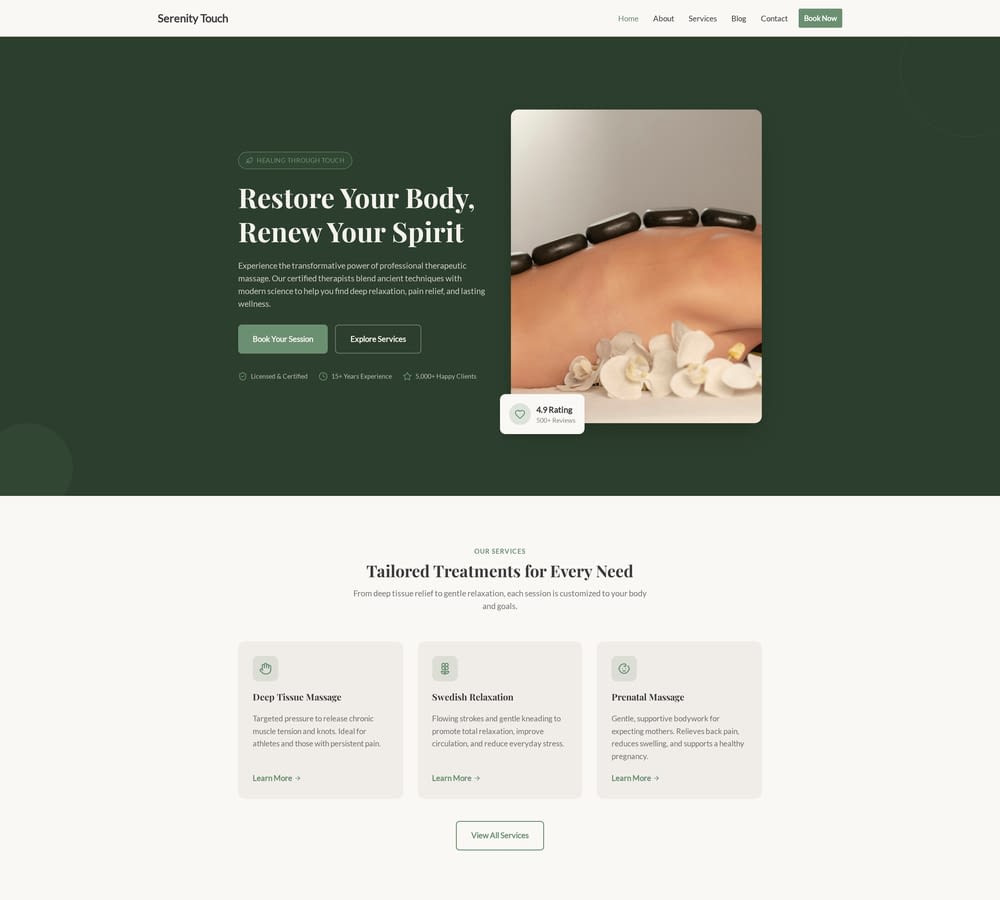 Calming massage therapy website template designed for independent massage therapists, bodywork practitioners, and wellness studios. Introduce your modalities, list session pricing, and let clients book online through a grounded, spa-inspired layout.