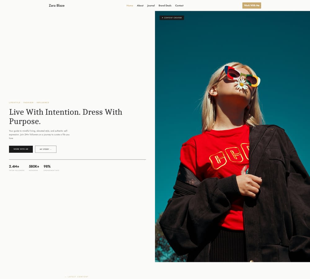 Bold TikTok influencer website template designed for creators, content makers, and personal brands. Link out to every social, highlight brand partnerships, and sell merch or courses with a punchy, Gen Z-forward design.